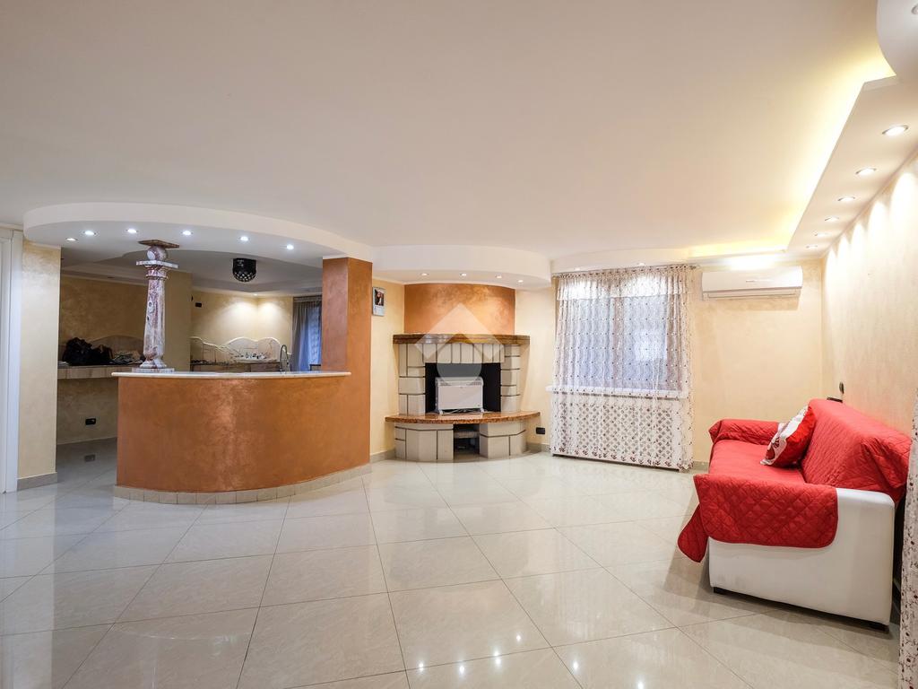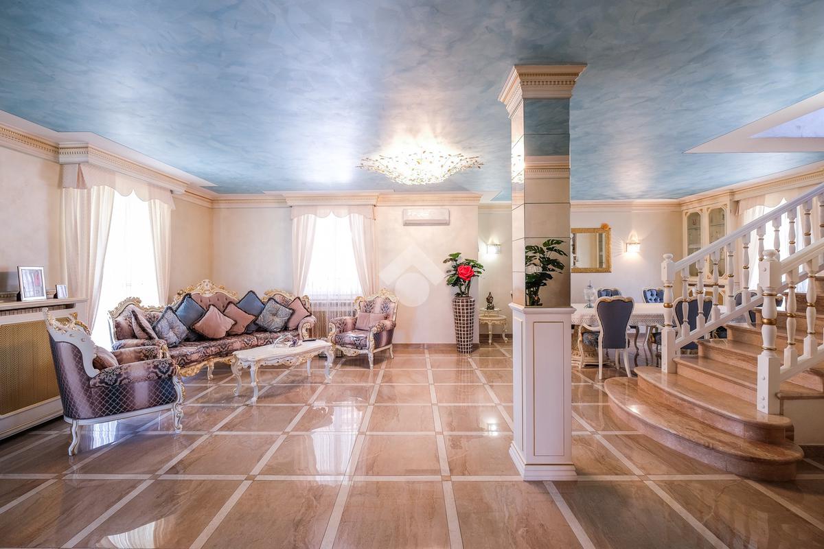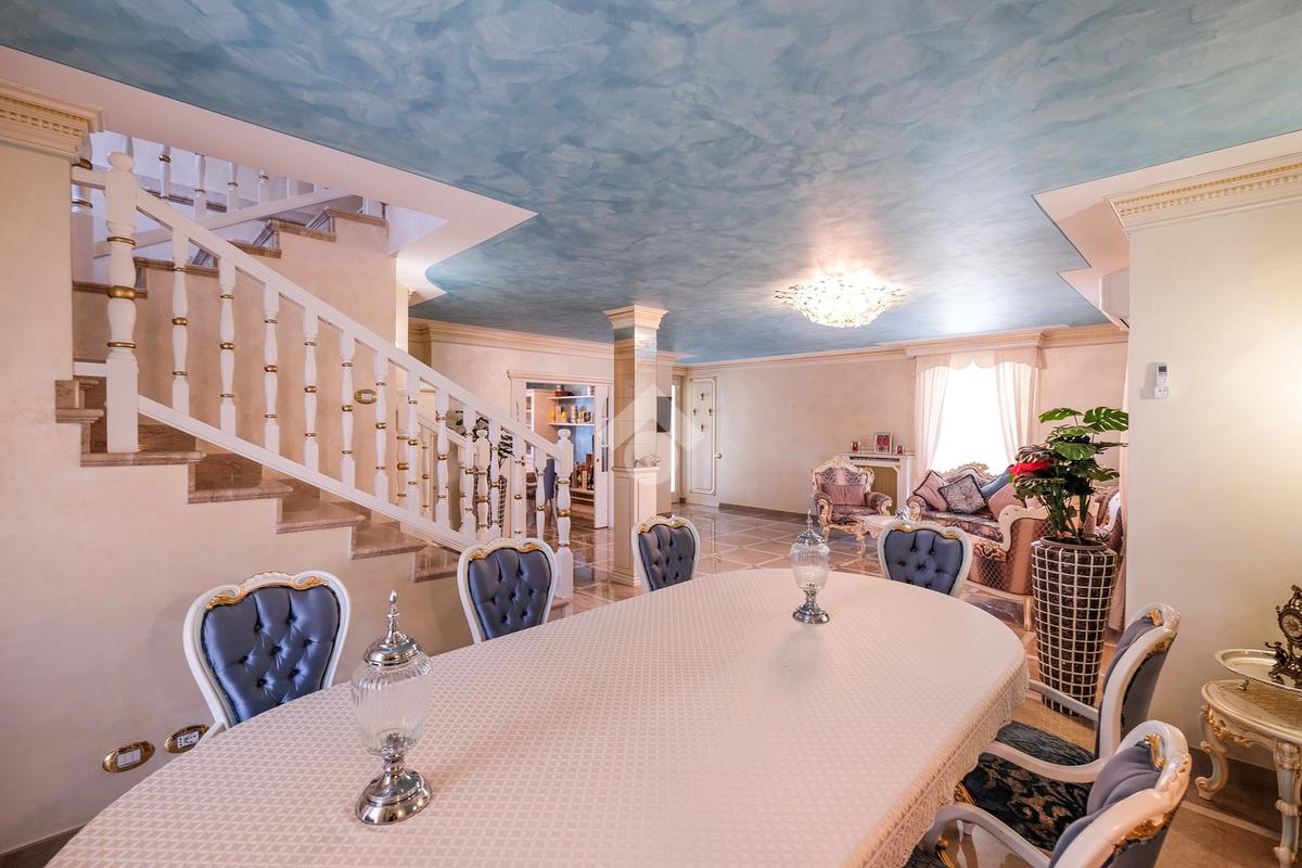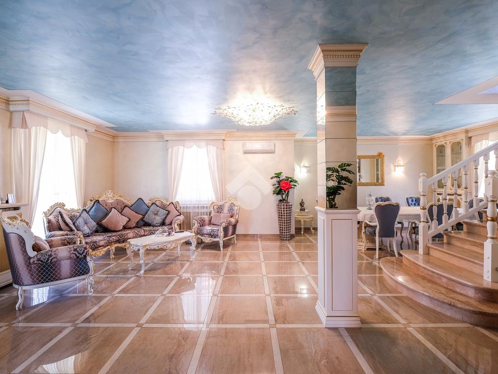 Tramite l'ingresso indipendente ed il vialetto di presentazione, si accede alla zona giorno composta dal soggiorno di grandissime metrature, suddiviso tra sala da pranzo ed un bellissimo angolo relax caratterizzato dalla pavimentazione in marmo.