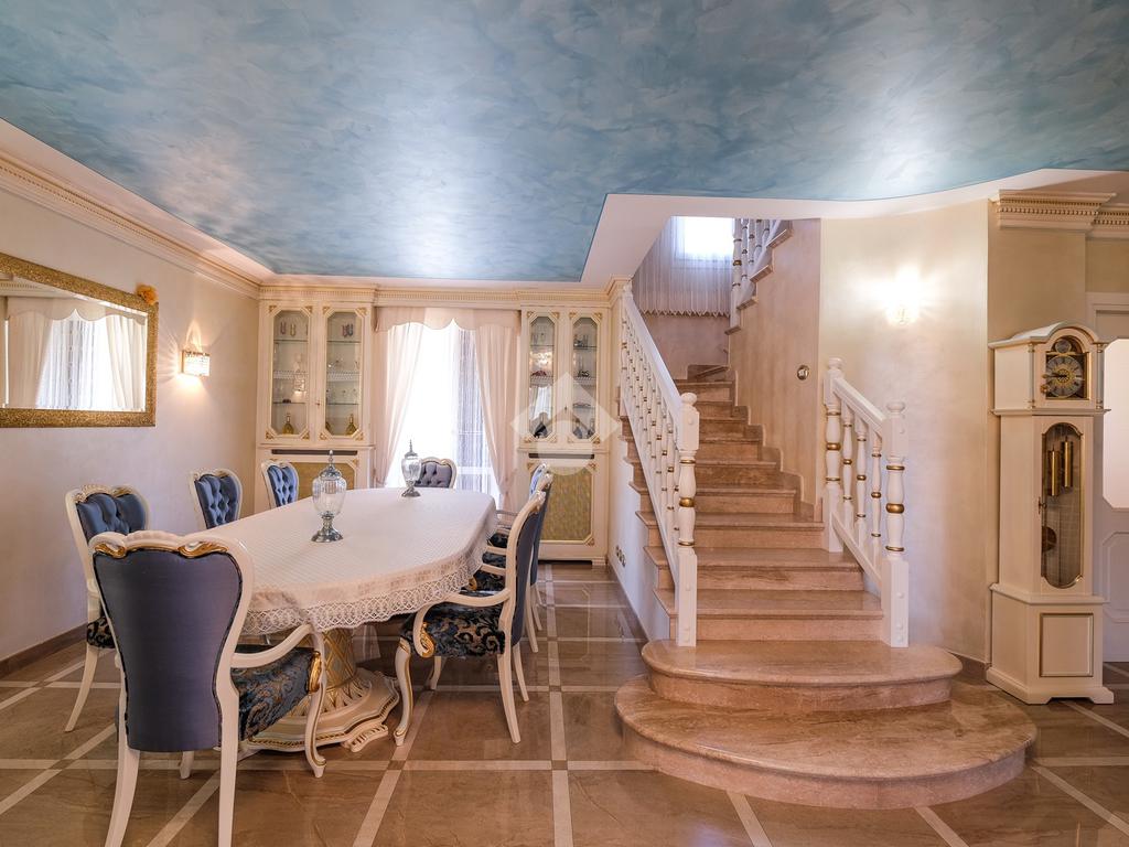 Al centro del salotto abbiamo un’imponete scala completamente rivestita da marmo spagnolo che ci accompagna al piano primo.